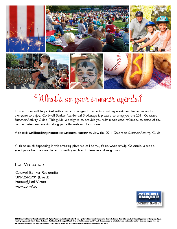 Posted on May 24, 2011 by Lori VialpandoHere’s a Great Summer Events Calendar for Colorado What to do this summer? Check it out! or visit www.coldwellbankerpromotions.com/summer Share this:Share Click to email a link to a friend (Opens in new window) Email Click to share on Facebook (Opens in new window) Facebook Click to share on X (Opens in new window) X Click to share on LinkedIn (Opens in new window) LinkedIn Click to share on Pinterest (Opens in new window) Pinterest Like Loading... Related