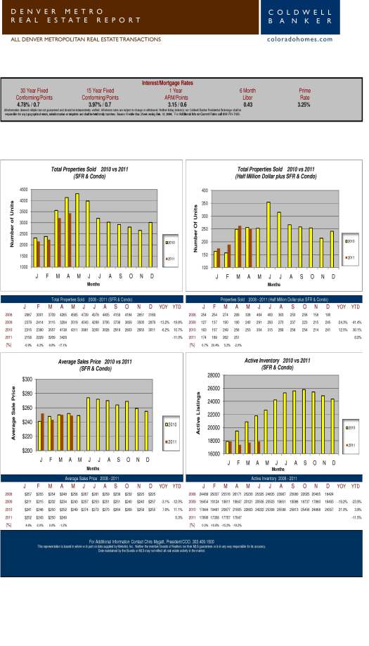 Buyers, now is the time to buy! Interest rates are low. The houses on the market are priced competively, and some are selling very quickly! I listed a home in Thornton last month, and it was under contract within a week of listing. The average sales price for metro Denver in April was $249,000. April of 2010 it was $252,000. Although down very slightly (1.2%), but relatively the same. For the 2011 year to date, the average sales price is up .3%.