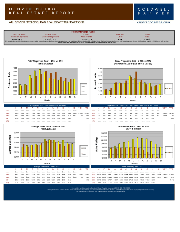 Yes! For 6 months in a row now, the number of properties sold have increased since the previous year. In November, we saw a 15.6% increase over November 2010. 3068 properties sold in November. The average sales price for November 2011 was $ 252,000.00. The active inventory on the Denver market is incredibly low, at just 12,634 – down 36.5% compared to Nov 2010 of 19881 properties listed. It seems that folks are waiting to list, but buyers are finding that the nice properties priced right are selling fast. Interest rates are still incredibly low, so if you are in the position to buy, its a great time!