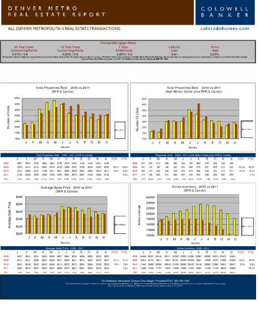 For the 7th month in a row, the total number of properties sold was up in the Denver Metro area in comparison to the same time the year before. In December, the number of properties sold was up 4.8%. For the year to date, the number of properties sold was up 2.8%. The average sales price was $254,000. In Dec 2010, that number was $254,000. The number of active listings is still INCREDIBLY low compared to the year before. The number of properties active in Dec was 10993, down 39.8%! Interest rates are still incredibly low. If you are in the market to buy, or thinking of selling your home, now is a great time – alot less competition. I am seeing the average number of days on market really low in some neighborhoods, even less than 30 days! Contact me for more information.