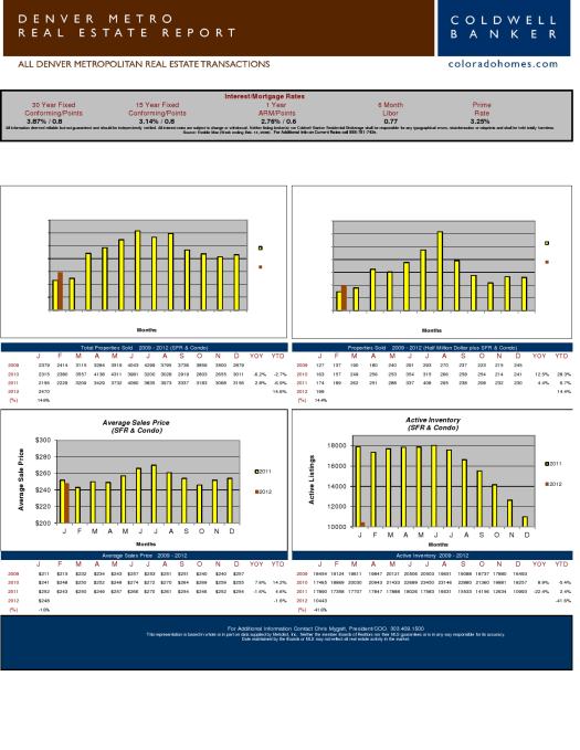 Once again, our Denver market shows improvement. The total properties sold went up 14.6% compared to this time last year. Our average days on market was 104 days. Keep in mind – this varies greatly from price range and neighborhood. I am seeing properties going under contract in less than a week, and in some cases multiple offers. In speaking with other Realtors, lenders, appraisors, and those active in the market saw a huge change just after the first of the year. Alot of this has to do with the incredibly low interest rates. Our inventory continues to be incredibly low, now with only 10443 active listings. Whats this mean – LESS competition if you are thinking of selling. Our average sales price for Jan was $248,000.00