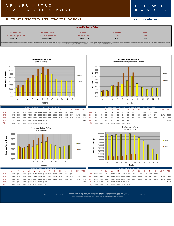 Our average sales price continues to increase compared to this time last year. July 2012 our average sales price was $289,000 – up 7.0% from this time last year (up 6.4% year to date). The number of properties sold for July 2012 was 4618, up 20.4% from this time last year. (Up 16.8% year to date) Again, we are still struggling with low inventory in the Denver metro area. Down 38.4% compared to last year. Buyers on the market are continuing to see themselves in a competitive situation when it comes to homes that are priced right and show well.