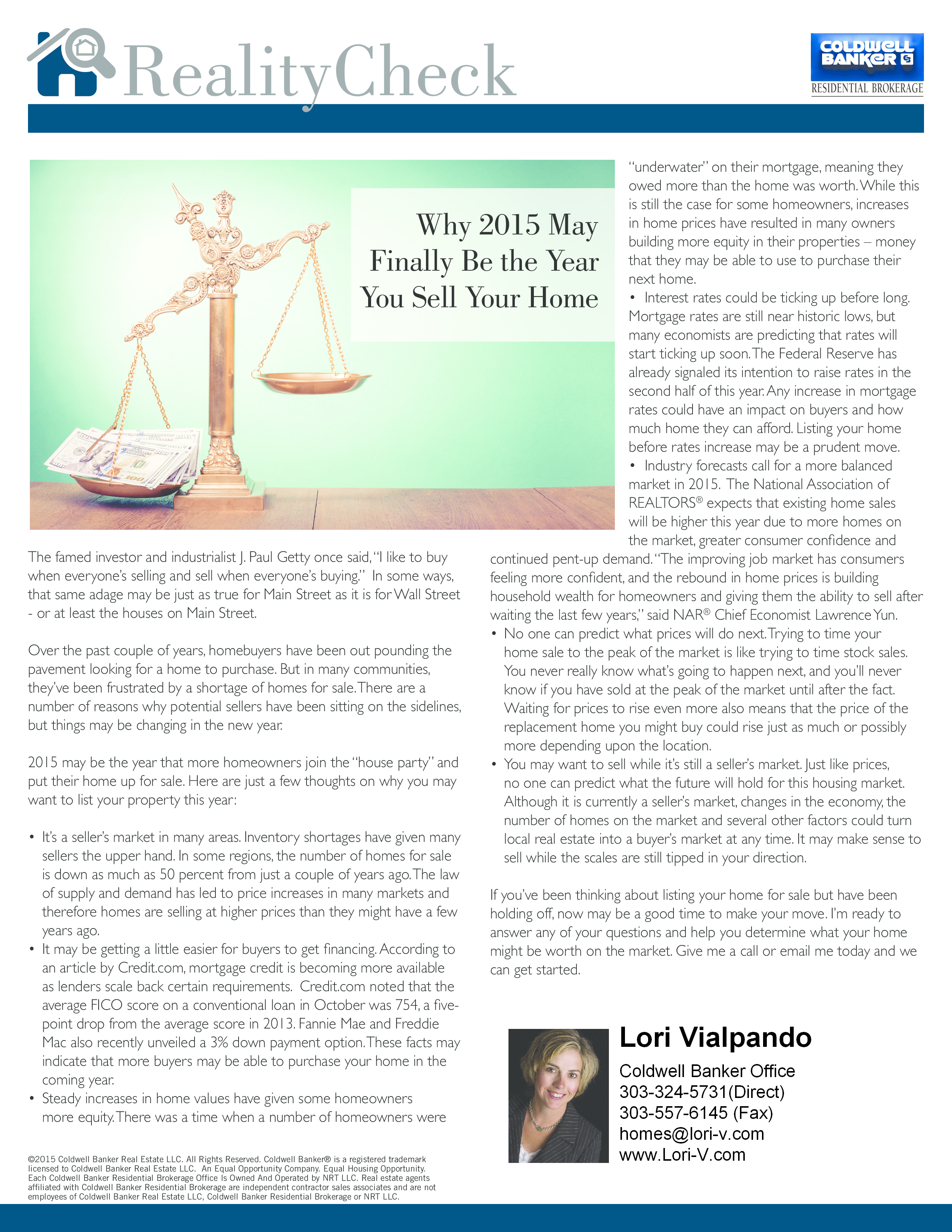Posted on February 11, 2015February 11, 2015 by Lori Vialpando*** Why 2015 May Finally Be the Year You Sell Your Home *** For a pdf version click here: 15COFebruaryRealityCheck Share this:Share Click to email a link to a friend (Opens in new window) Email Click to share on Facebook (Opens in new window) Facebook Click to share on X (Opens in new window) X Click to share on LinkedIn (Opens in new window) LinkedIn Click to share on Pinterest (Opens in new window) Pinterest Like Loading... Related