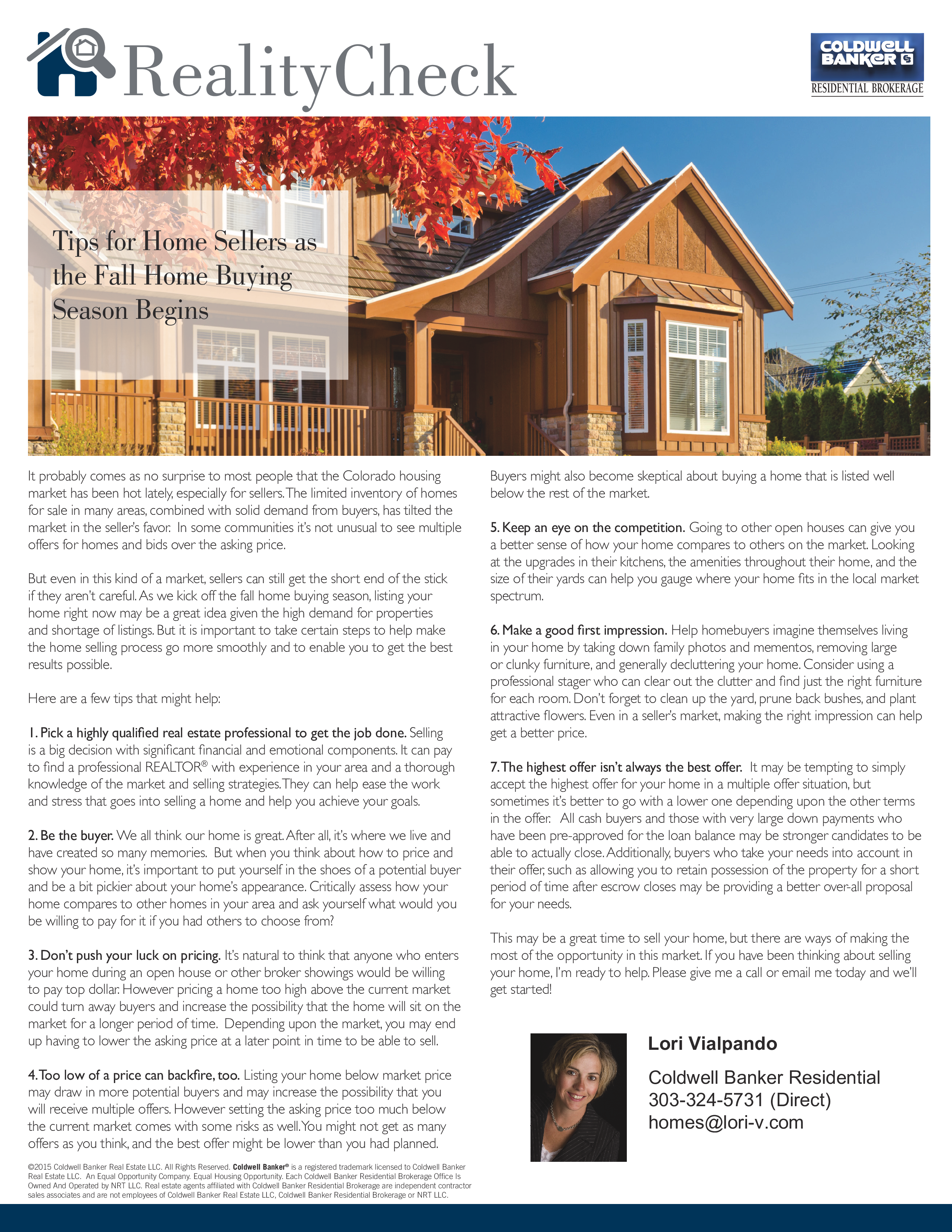 Posted on October 12, 2015October 8, 2015 by Lori Vialpando*** Tips for Home Sellers as the Fall Home Buying Season Begins *** Share this:Share Click to email a link to a friend (Opens in new window) Email Click to share on Facebook (Opens in new window) Facebook Click to share on X (Opens in new window) X Click to share on LinkedIn (Opens in new window) LinkedIn Click to share on Pinterest (Opens in new window) Pinterest Like Loading... Related