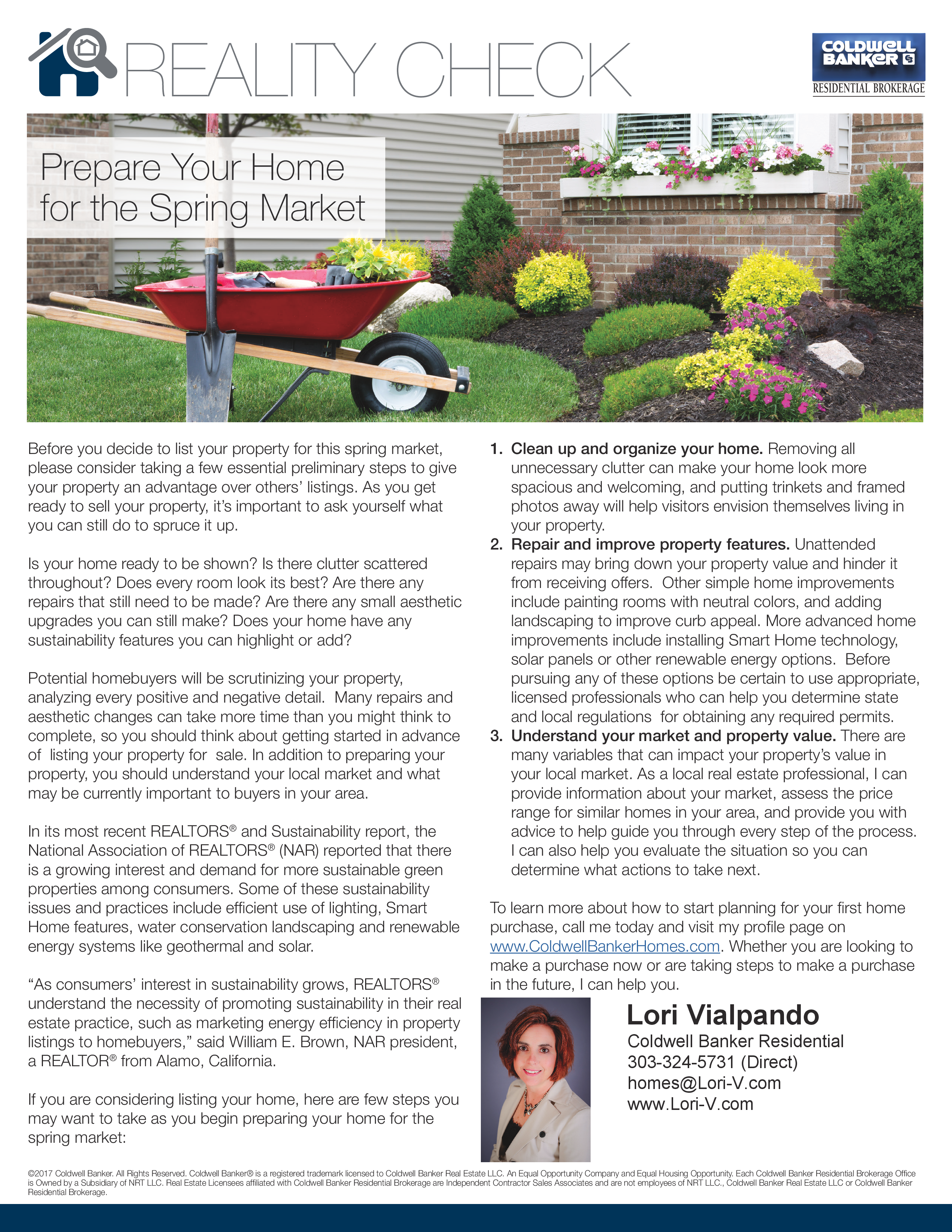 Posted on May 26, 2017May 26, 2017 by Lori Vialpando*** May Reality Check: Prepare Your Home for the Market *** Lori Vialpando Coldwell Banker Residential 303-324-5731 homes@lori-v.com #DenverRealtorRuns #DenverMilitaryRealtor Share this:Share Click to email a link to a friend (Opens in new window) Email Click to share on Facebook (Opens in new window) Facebook Click to share on X (Opens in new window) X Click to share on LinkedIn (Opens in new window) LinkedIn Click to share on Pinterest (Opens in new window) Pinterest Like Loading... Related