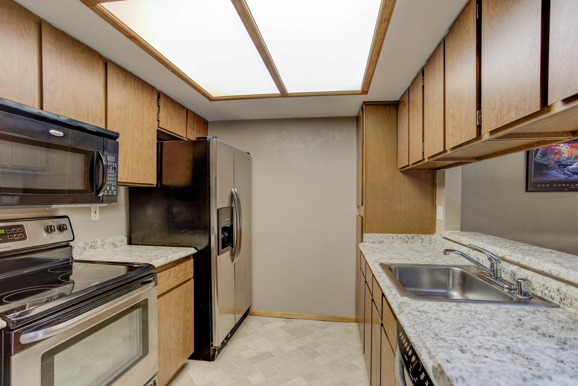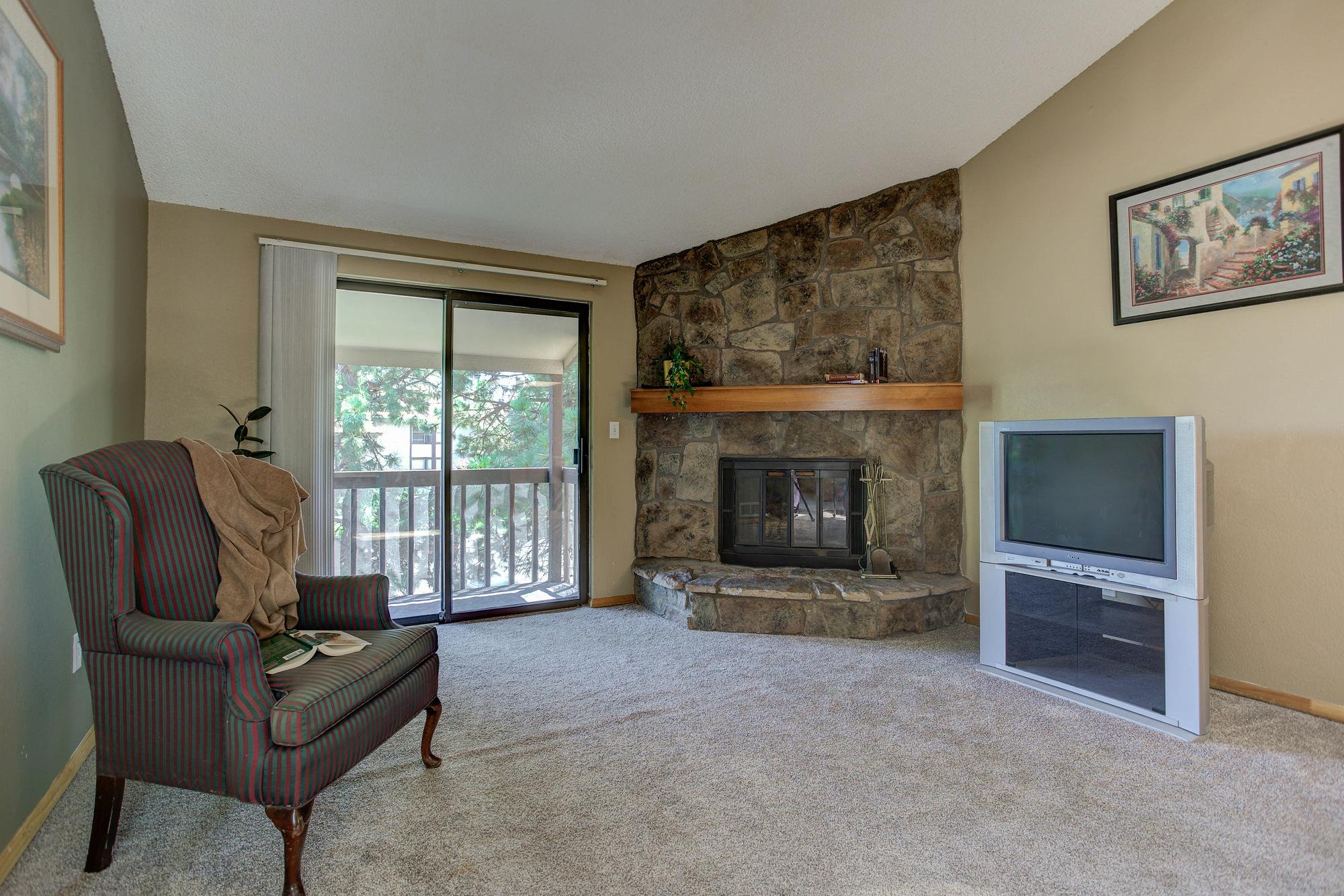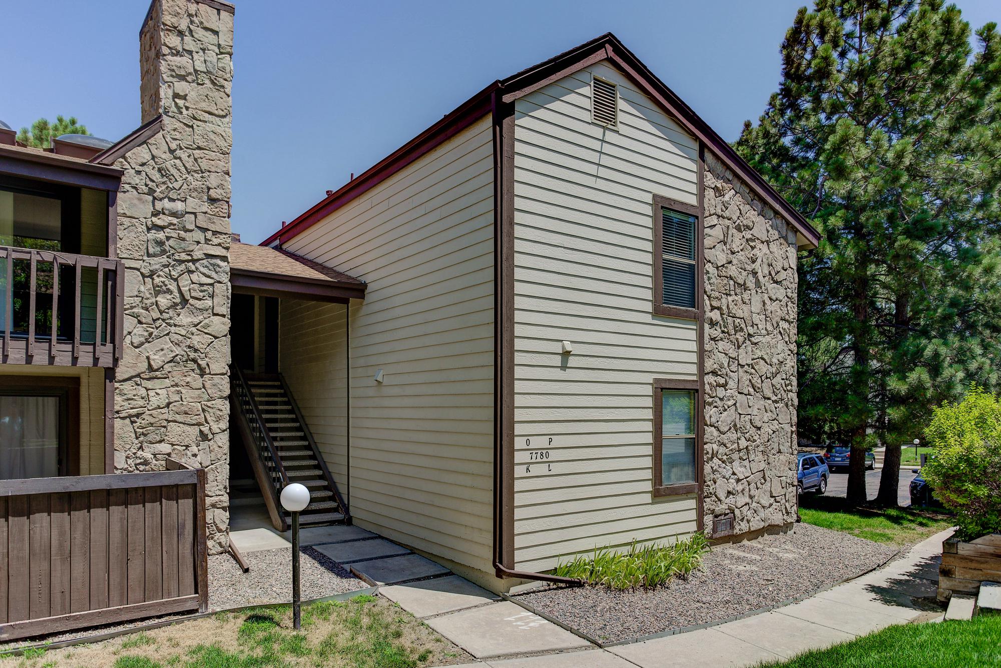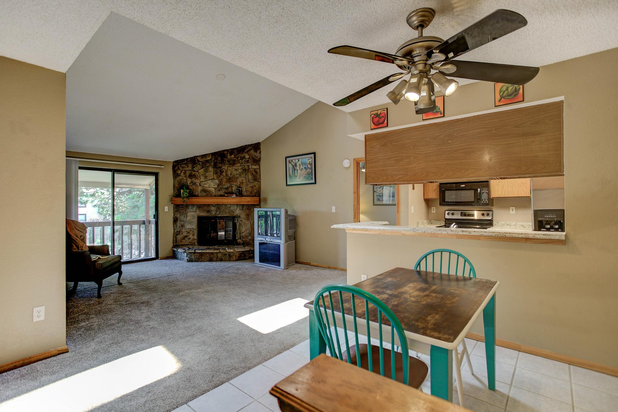 This rare upper level condo unit in Mountain Vista Village is just waiting for a new owner. Newer flooring, carpet, counter tops, furnace, and A/C. Large family room with vaulted ceilings, skylights, and a stone fireplace for cozy winter evenings. Two spacious bedrooms and a master with huge walk-in closet and its own private bath. All appliances stay, including the in-unit washer & dryer. Balcony deck & huge storage space are just a bonus. Why rent when you can own! Community has pool & tennis courts for recreation. Close to tons of shopping, recreation, restaurants, Nottingham Park, & walking paths. Includes one reserved parking spot, plus ample visitor parking.