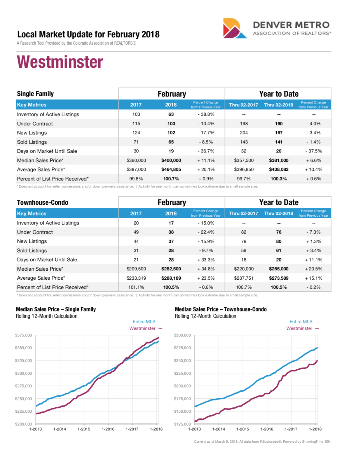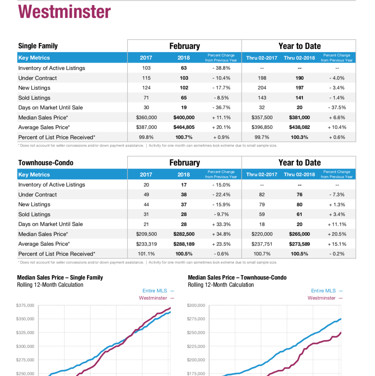 Here’s a bit of insight on the #Westminster #realestate market – the number of single family active listings were WAY down compared to last year same time (-38.8%), the amount of properties going under contract decreased by -10.4%. The average sales price is now $464,805.00 (up 20.1% from last year) WOW!