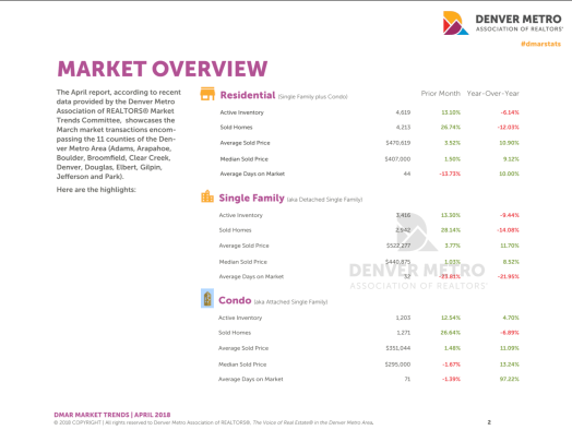 Still super low inventory for this time of year, an increase in the average sales price compared to last year, and a drop in days on market – now 44 days. WOW! The average sales price for single family home in the Denver metro area now sits at $522,277