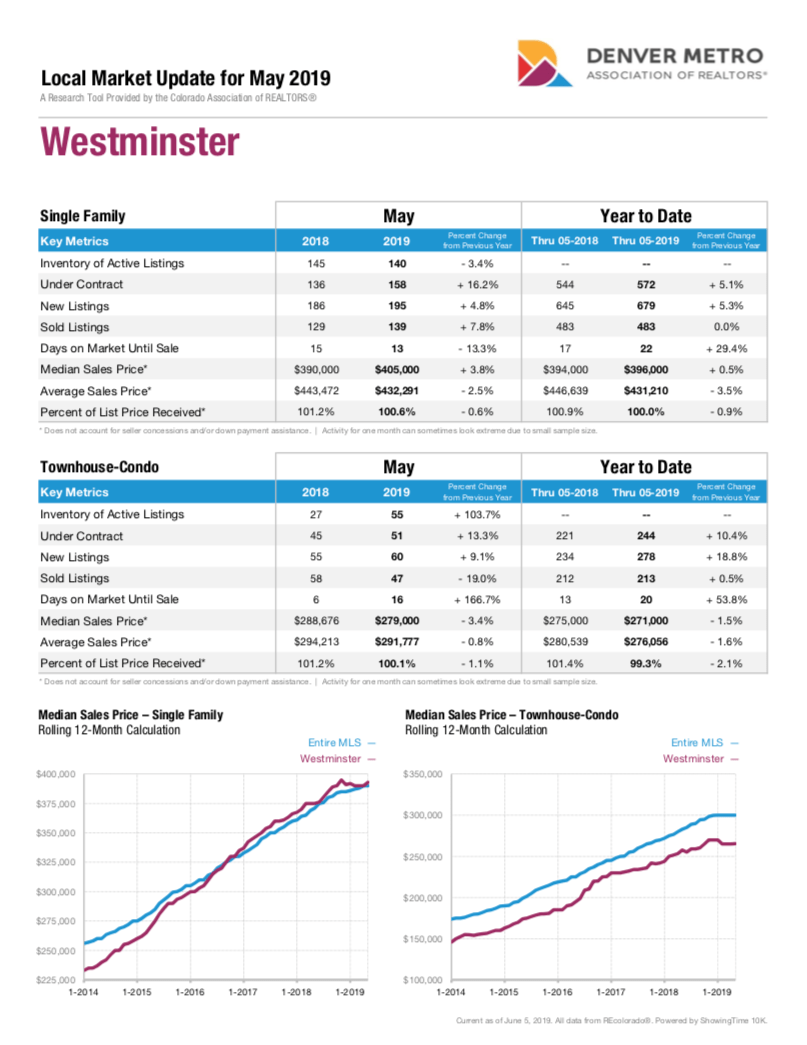 Here’s a bit of insight on the #Westminster #realestate market for the month of May 2019 – the number of single family active listings were down compared to same time last year same time (-3.4%), the amount of properties going under contract increased by 16.2%. The average sales price is now $432,291.00 (down -2.5% from last year) . The average days on market decreased slightly compared to last May, at 13 days. #DMARStats
