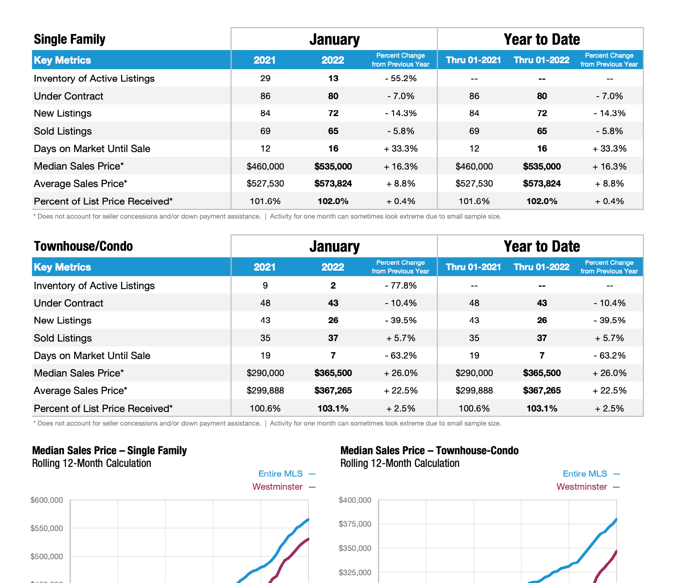 The average sales price in Westminster for January was $573,824!!! Up 8.8% compared to same time last year and the average days on market was just 16!