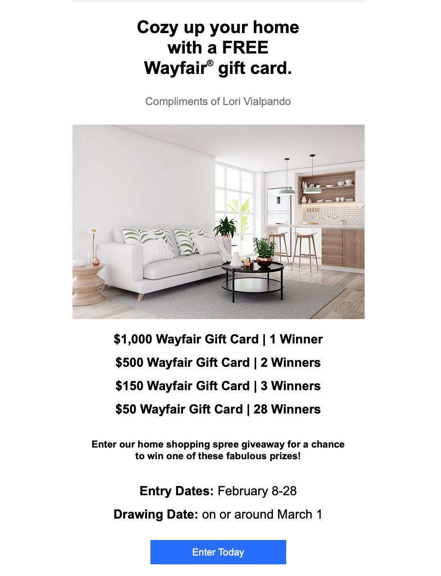Posted on February 22, 2022February 21, 2022 by Lori Vialpando*** Its the Wayfair Giveaway Compliments of Coldwell Banker Realty! *** Enter Giveaway Here Lori Vialpando Coldwell Banker Realty 303-324-5731 homes@lori-v.com www.Lori-V.com #DenverMilitaryRealtor Share this:Share Click to email a link to a friend (Opens in new window) Email Click to share on Facebook (Opens in new window) Facebook Click to share on X (Opens in new window) X Click to share on LinkedIn (Opens in new window) LinkedIn Click to share on Pinterest (Opens in new window) Pinterest Like Loading... Related