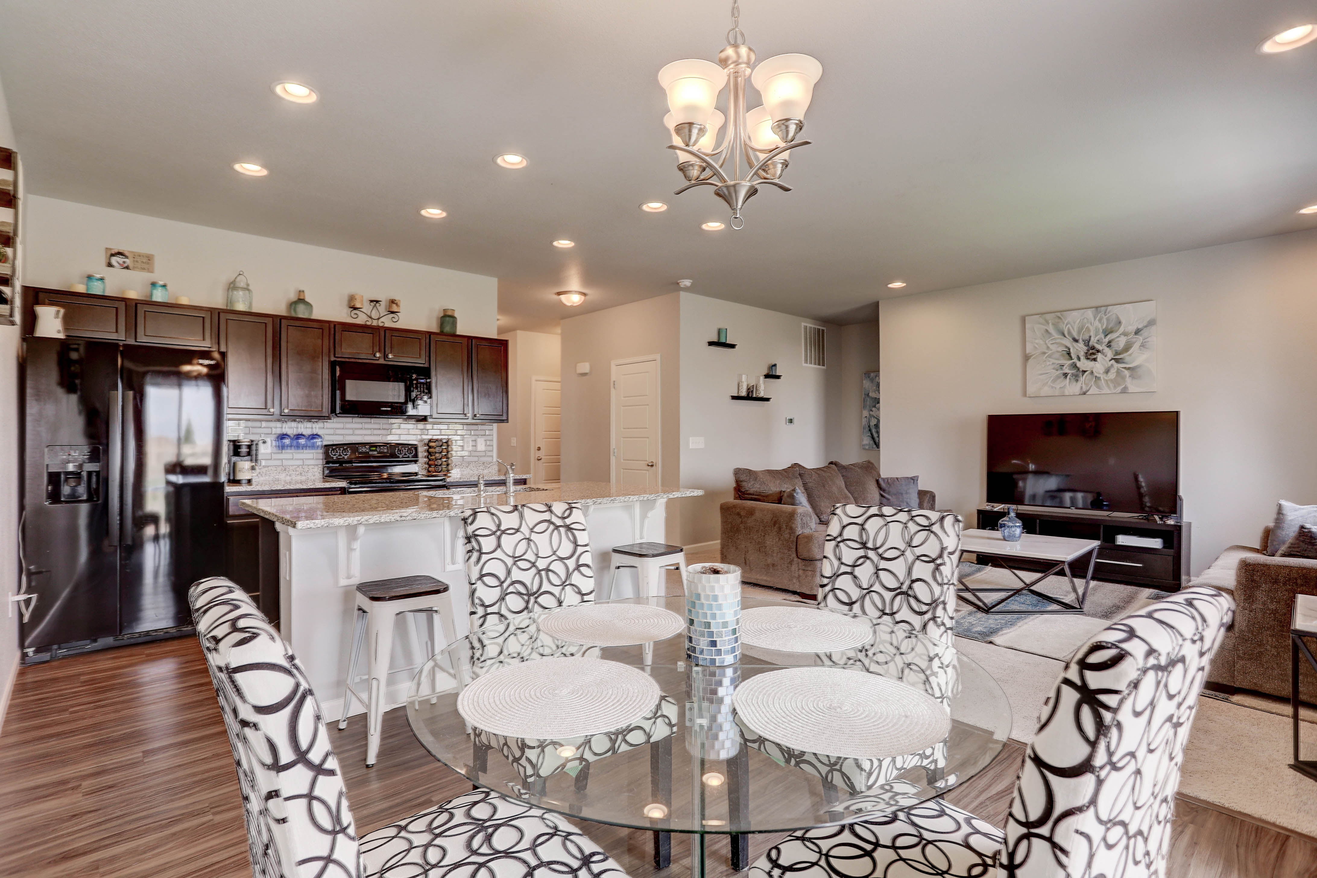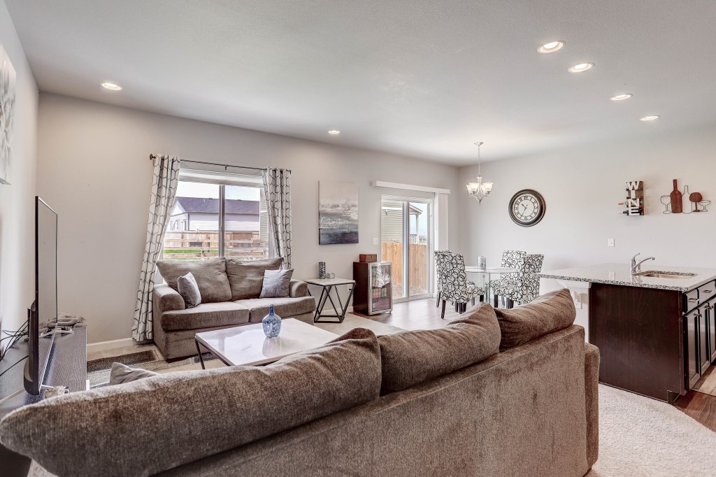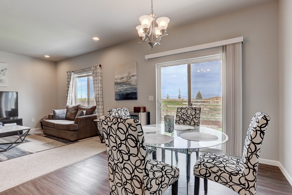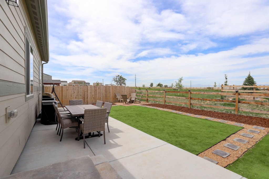 This amazing 2 year new ranch home offers 3 bedrooms, 2 baths and 1417 square feet. Kitchen workspace with granite counters is open to the entertaining area, perfect for gatherings. Easy access to the back yard for grilling. You’ve got to see the mountain views from the family room, master bedroom & back yard! Low HOA fees. Nearby trails and large Clem Dufour community park / splash park. Quick access to I-25.