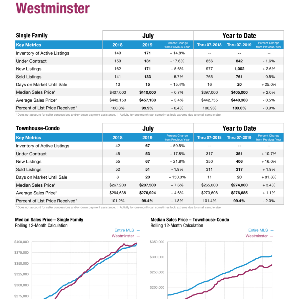 *** The Westminster CO Real Estate Stats for July 2019 ***