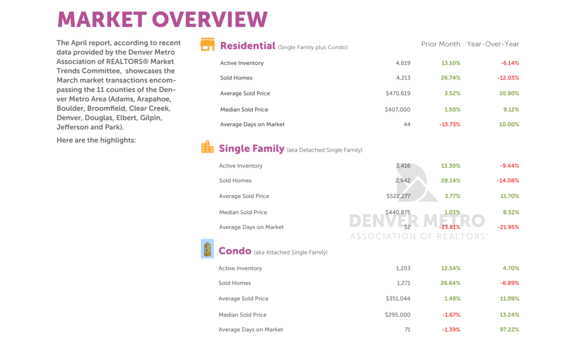 Here's a quick peek at what happened during the month of March in the Denver real estate market. Still super low inventory for this time of year, an increase in the average sales price compared to last year, and a drop in days on market - now 44 days. WOW! The average sales price for …
