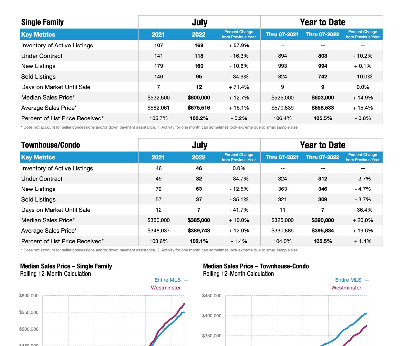 Here’s some real estate stats specifically for Westminster, Colorado! Reminder that these compare to same time last year, not last month. Our inventory went up, and its taking a bit longer for homes to sell. HOWEVER, the average sales price in Westminster for July was up $675,516!!! Up 16.1% compared to same time last year …